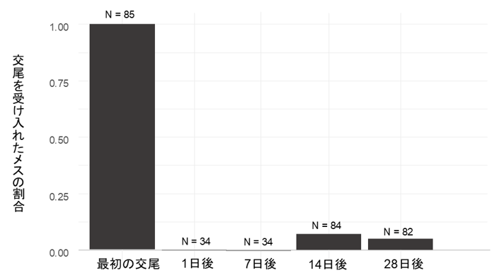 図1.メスの交尾率の変化。初回の交尾ではすべてのメスが交尾を受け入れたが、1~28日後に別のオスと引き合わせても、再交尾率はわずか0~7%にとどまった。