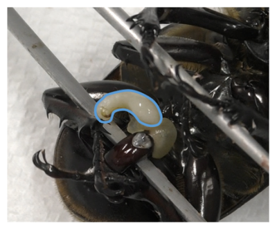 では、どのようなメカニズムでメスは再交尾を拒絶するようになるのでしょうか。一部の昆虫のオスは、精子やタンパク質などの栄養を含む“精包”と呼ばれるカプセル(図2)を交尾の際にメスの交尾器内に送り込みます。研究グループは、精包に含まれる化学物質が原因か、あるいは交尾時の物理的な刺激が原因かを探るため、2つの実験を行いました。1つ目は、精包の抽出液をメスの体液中に直接注射する実験です。他の昆虫ではこの方法で再交尾が抑制されることがありますが、カブトムシのメスは注射後もオスとの交尾を受け入れました。2つ目は、交尾を途中で人為的に中断させる実験です。オスの生殖器が挿入されてから15分後に強制的に引き離したところ、このメスも翌日には別のオスと交尾しました。これらの結果から、単なる化学物質の血中への移行や、生殖器への物理的な刺激だけでは、メスの再交尾を抑制するには不十分であることがわかりました。メスの生殖器内が精包で物理的に満たされることなど、より複雑なメカニズムが関与していることが示唆されました。