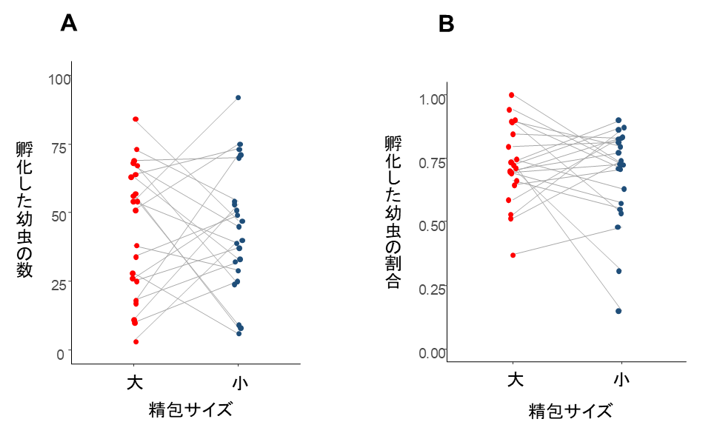 図3.精包のサイズと繁殖成績の関係。通常の大きな精包を受け取ったメスと、小さな精包を受け取ったメスが残した孵化幼虫の数(A)と卵の孵化率(B)。精包のサイズが変わっても繁殖成績には影響しないことがわかる(グラフ内の線は、同じオスとの交尾に由来するデータを結んでいる)。