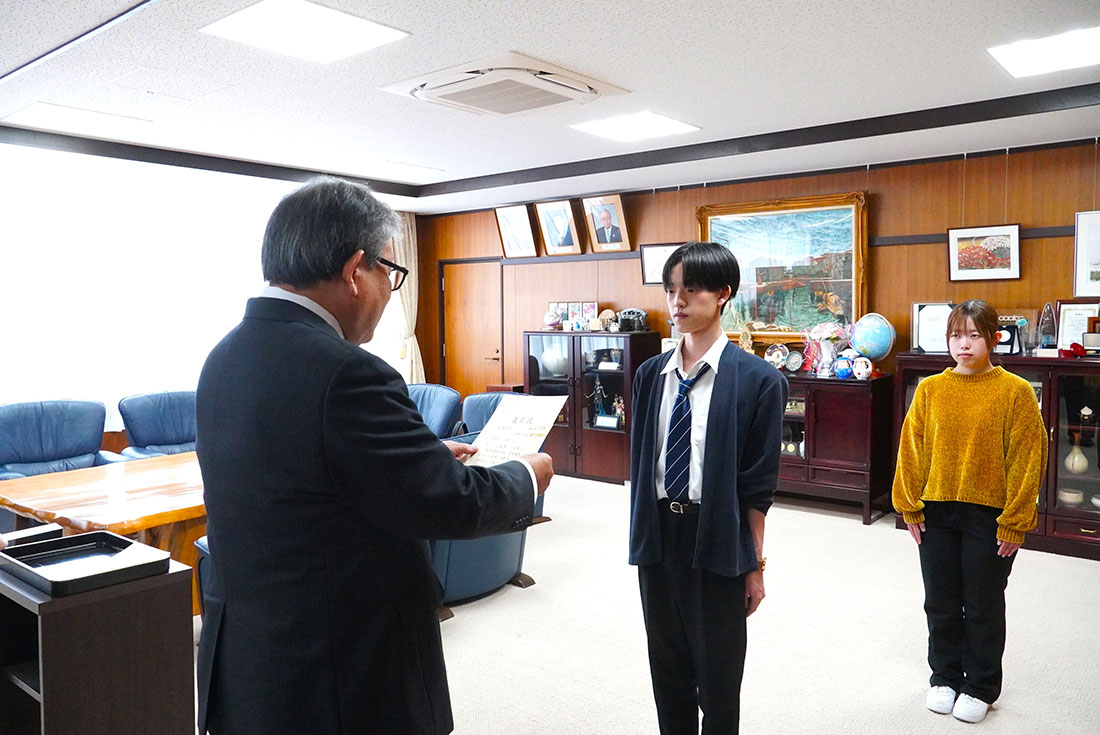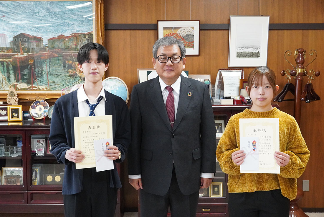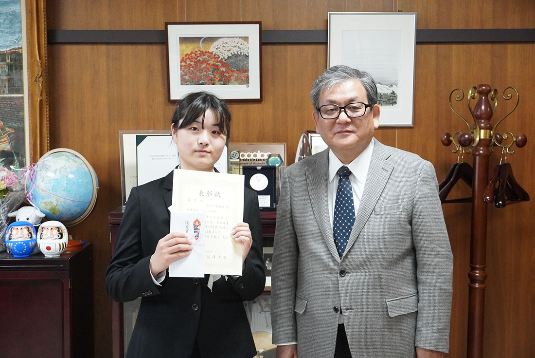 3月30日(月)及び31日(火)に、受賞者への表彰式を実施しました。表彰式では、谷澤学長から受賞者に対し表彰状と副賞が送られました。谷澤学長からは、応募に対する感謝とともに受賞者への祝福の言葉が送られ、「最優秀賞の『希望の丘』という名称は今後、山口大学で末永く使用され、愛され続けると期待している。学生の皆さんも、『希望の丘』に親しみ、活用してほしい」と述べました。