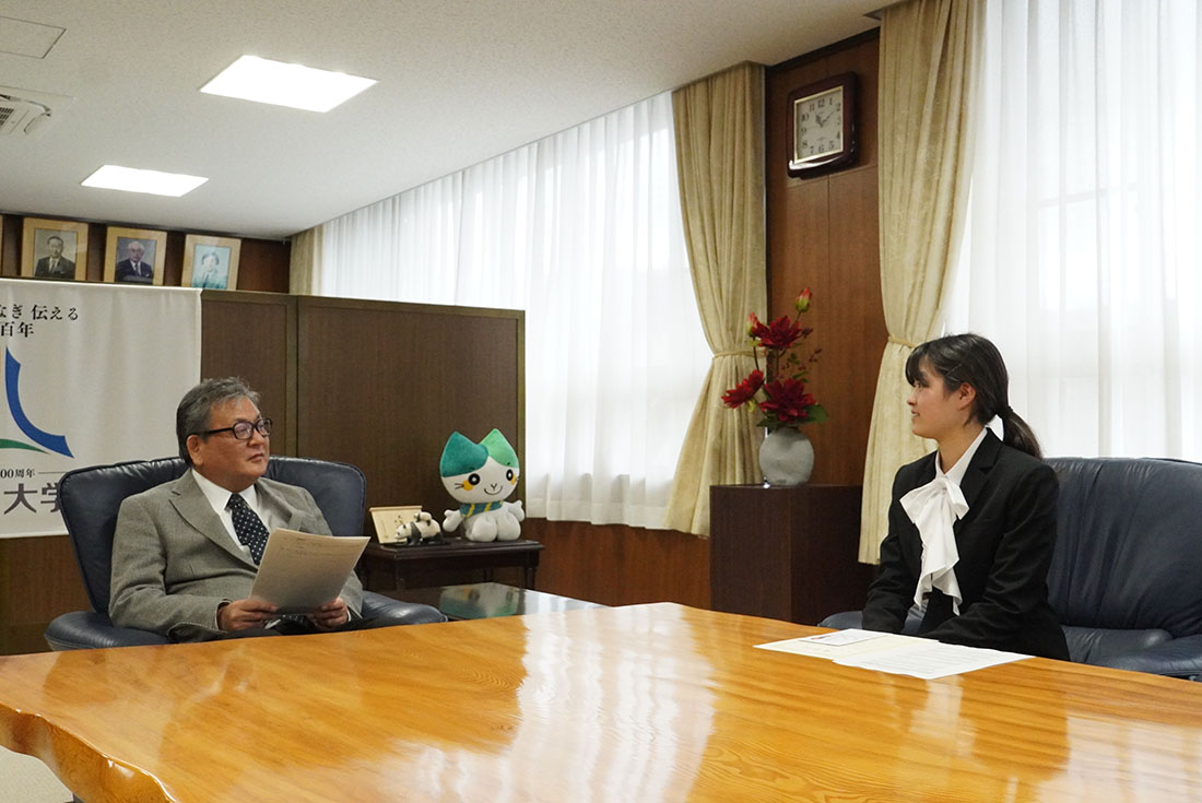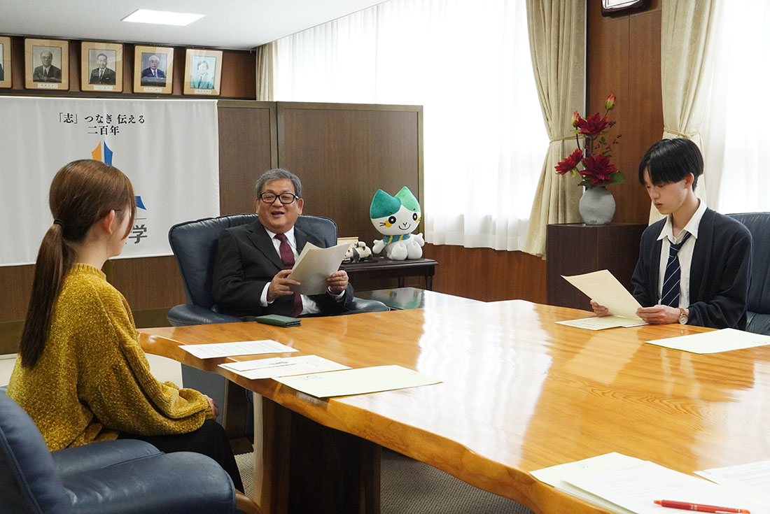 表彰式後には谷澤学長と受賞者との懇談が行われ、最優秀賞を受賞した人文学部3年(当時)の三重野皓太さんは、「『希望の丘』にある樹から自身も希望を感じている。多くの方に利用していただきたい」と受賞の喜びとともに名称に込めた思いを話しました。また、谷澤学長と学生がそれぞれ「希望の丘」に関するエピソードや「山口大学のおすすめスポット」を紹介するなど、終始和やかな雰囲気の懇談となりました。