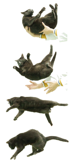 ネコは高い所から落ちたとき、空中で体勢を立て直し、足から安全に着地することができます。この行動はネコひねり、学術的には「立ち直り反射」と呼ばれます(図1)。立ち直り反射の能力はすべての動物に備わっているわけではなく、たとえば、イヌが立ち直り反射をするという話を耳にすることはありません。