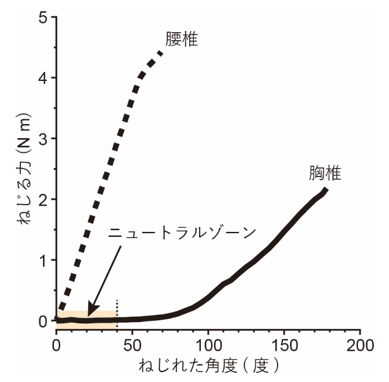 病理解剖のために山口大学に寄贈された5匹の遺体から胸椎と腰椎を採取し、荷重試験機に取り付けて、壊れるまで一方向にねじり、ねじる力とねじれた角度の関係を明らかにしました(図2)。胸椎には片側47度(左右両側では94度と推定)まで、ほとんど抵抗力が発生しないニュートラルゾーンが存在しました。しかし、腰椎にはニュートラルゾーンはほぼ存在せず、強い抵抗力が生じました。胸椎は最大で片側171度までねじれましたが、腰椎は片側57度までしかねじれませんでした。以上の結果から、ネコの胸椎は腰椎よりも非常にねじれやすいことがわかりました。
