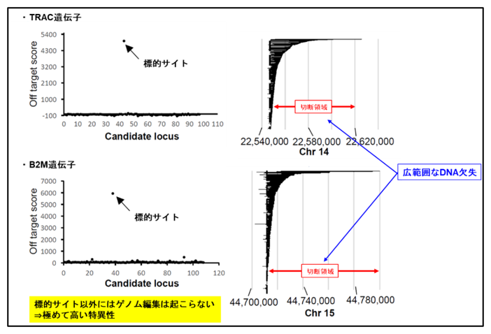 さらに、作製した改変T細胞のゲノム構造を解析したところ、Cas3による編集は標的領域において、顕著なオフターゲット効果は検出されず、極めて高い標的特異性を持つことを示しました。また、広い範囲のDNA欠失を伴う遺伝子破壊を引き起こすことを確認しました(図2)。